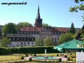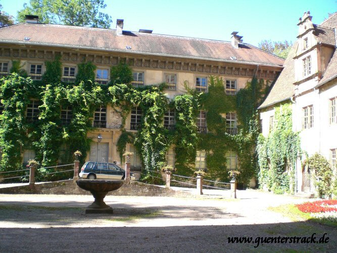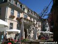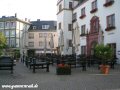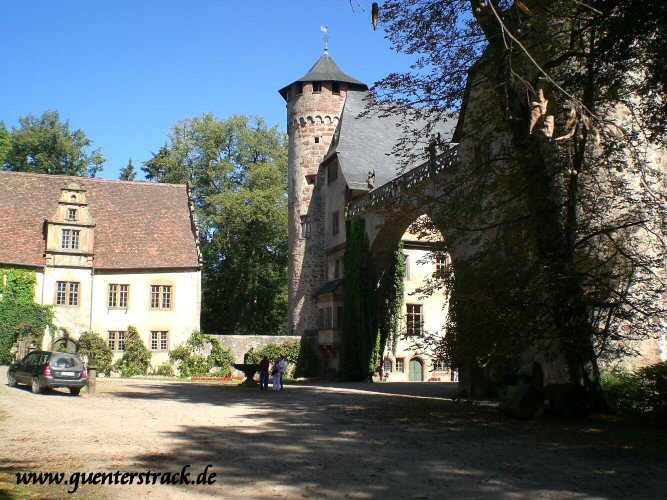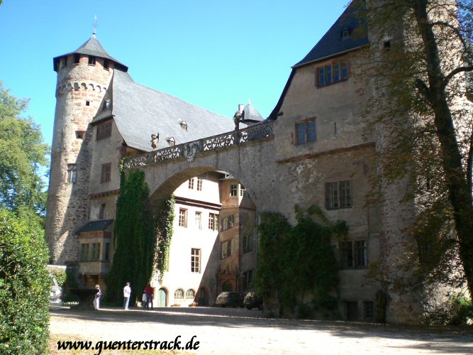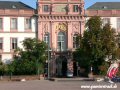 Als ich nun auch den Stadtkern von Michelstadt ausgiebig fotografiert hatte, hab ich mir zum Mittag erst mal´ne Kugel Eis gegönnt. Das Wetter war herrlich, die Sonne schien den ganzen Tag. Nun machte ich mich weiter auf den Weg zum Schloss Fürstenau. Dieses liegt am Stadtrand von Michelstadt. Man kann hier kostenlos den Schlosshof besichtigen. Ein paar Gehminuten vom Schloss entfernt gibt es noch eine alte Basilika zu bewundern, die ich mir noch kurz angesehen habe. Dann ging es wieder zurück durch die Michelstädter Altstadt und weiter an der Hauptstraße entlang bis nach Erbach. Gegen etwa 16 Uhr war ich wieder bei meinem Auto angekommen und machte mich auf den Rückweg nach Darmstadt. Ich wählte diesmal eine andere Strecke durch den Odenwald, um mir noch ein wenig die schöne Landschaft anzusehen. Im Hotel angekommen habe ich mir erst mal meine armen Füsse betrachtet - die waren total zerlaufen. Aber nicht nur das, als ich in den Spiegel sah hat mich fast der Schlag getroffen. Ich hatte mir vom Herumlaufen in der Sonne einen mächtigen Sonnenbrand eingefangen. So krebsrot auf Stirn und Nase war ich schon lange nicht mehr. Aber keine Zeit zum Selbstmitleid, am Abend gings wieder ab in die Darmstädter Innenstadt. Ich habe mich dort mit 4 Drombuschfans getroffen, Christof und Christof von der Drombusch-Webseite und Marco und Tobi. Die vier hatten ebenfalls den schönen Tag genutzt, um noch einige der fehlenden Drombuschdrehorte anzufahren und zu fotografieren. Wir aßen zusammen in der "Grohe" und berichteten einander von den Abenteuern des Tages. Nach dem Essen gings dann ab zum Hotel der beiden Christofs. Dort setzten wir uns an die Bar und sahen uns einiges Material für die Drombusch- Webseite an. Dann verabredeten wir uns für den nächsten Tag. Am Sonntag war ich schon sehr früh wach und da es erst 12 Uhr mittags losgehen sollte, beschloss ich noch mal schnell in die Innenstadt zu fahren, um endlich meine Fotos vom Freitag zu wiederholen. Um diese frühe Uhrzeit war die Stadt noch ziemlich leer und die Biergärten verstellten mir die Motive nicht mehr.