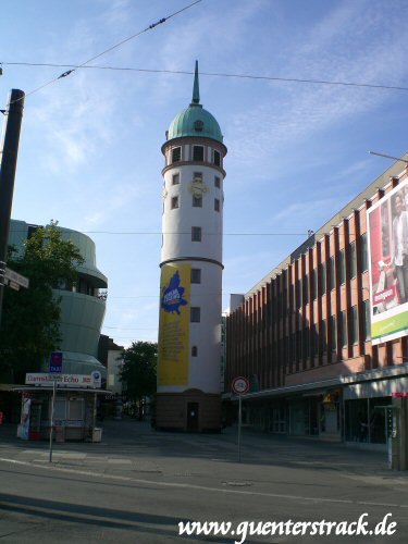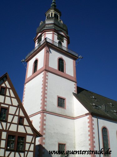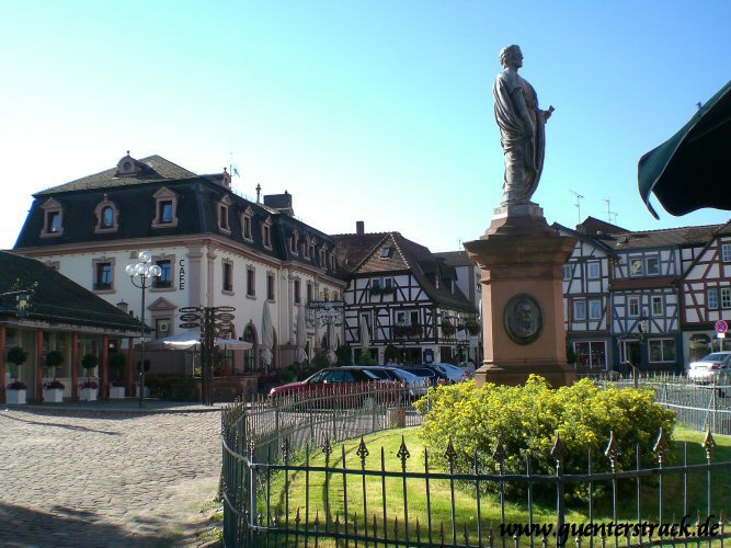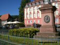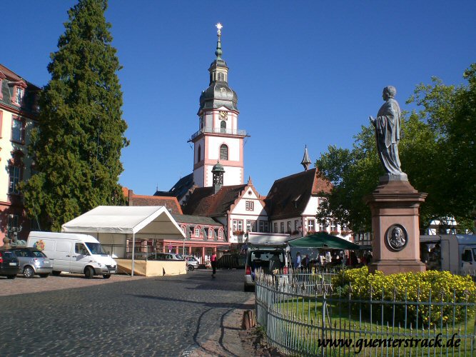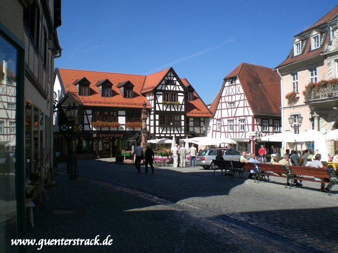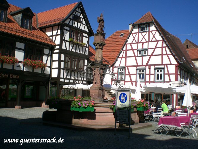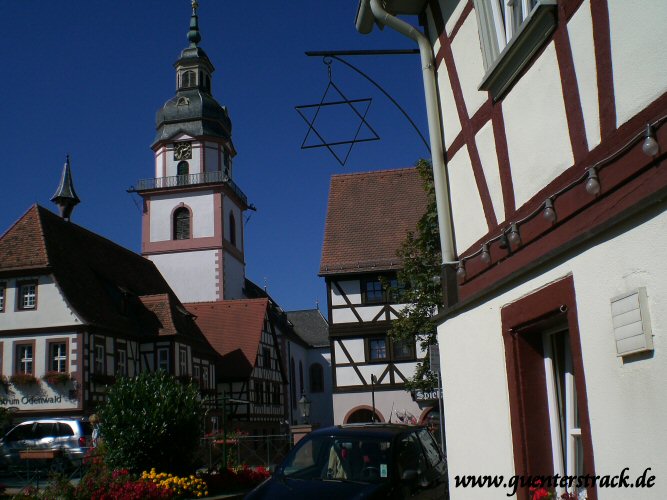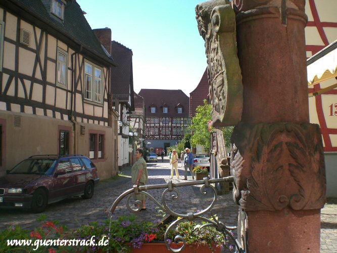 Hallo liebe Günter-Fans,2006 war für mich ein sehr ereignisreiches Jahr und so ist es auch nicht verwunderlich, dass ich noch einmal nach Darmstadt gereist war. Ich wollte hier und in der näheren Umgebung nach den Originaldrehorten der "Hessischen Geschichten" suchen. Deshalb gingen auch dieser Reise bereits etliche Recherchen und Planungen voraus, denn die Zeit einer solchen Fanreise muß ja auch ordentlich genutzt werden - kostet ja schließlich Geld. So ging es am Freitag, den 8. September, direkt nach Arbeitschluss los. In Darmstadt angekommen und im Hotel eingecheckt fuhr ich gleich ins Stadtzentrum, um bereits die ersten Fotos zu machen, doch die ganzen Biergärten mit ihren aufgespannten Schirmen verstellten mir die Motive, so dass ich die Fotosession abbrach und mich lieber zum befreundeten Videoclub aufmachte. Abends bin ich dann todmüde in mein Hotelbett gefallen - was ich noch nicht wußte, der nächste Tag sollte eine Menge Kraft kosten. Samstag früh um 7 klingelte mein Wecker und ich sprang schnell unter die Dusche, dann ab zum Frühstück und wieder ins Zimmer, meinen Rucksack packen. Ich hatte mir in den Wochen vor der Reise ausgiebig alle Folgen der Hessischen Geschichten angesehen und Bilder von den Drehorten gemacht, die ich nun in ausgedruckter Form mitgebracht hatte. Anhand dieser Vorlage wollte ich also losziehen, die Drehorte nach so vielen Jahren wieder zu finden. Mit vollem Tatendrang eilte ich zu meinem Auto und ab ging es durch den Odenwald von Darmstadt nach Michelstadt und Erbach. Mein Plan bestand eigentlich darin, dass ich mir in Michelstadt einen Parkplatz suchen und alles fotografieren wollte und dann nach Erbach weiter fahren, um das selbe dort zu wiederholen, aber wie das in einer fremden Stadt so ist, bin ich vor lauter Aufregung in Michelstadt an allen Parkplätzen vorbei gefahren. Ich beschloß also, gleich nach Erbach zu fahren und dort mit meiner Tour anzufangen. Habe zum Glück auch gleich einen kostenlosen Parkplatz in der Nähe des Stadtkerns ergattert. Noch mal schnell gescheckt, ob alles notwendige im Rucksack ist - Fotoapparat, die Bilder der Drehorte, Handy, Geldbörse und was zu trinken - eins fehlte, ein Stadtplan! Zum Glück war eine Tankstelle nicht weit entfernt und ich holte mir einen Plan. Beim Betrachten der Wegstrecke zwischen Michelstadt und Erbach entschied ich mich spontan das Auto stehen zu lassen und die ganze Strecke zu laufen. Ich zog also punkt 9 Uhr erst mal zum Erbacher Marktplatz los.
