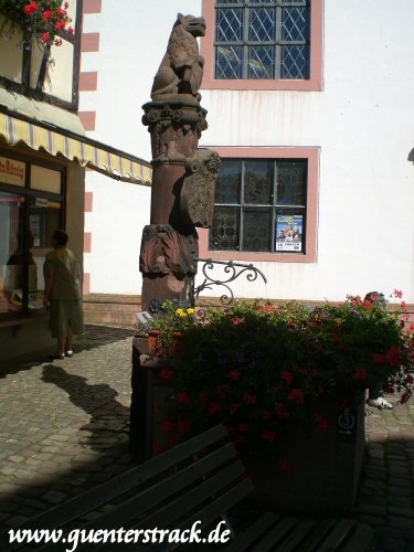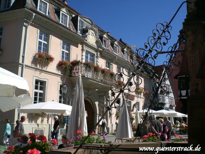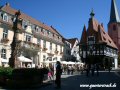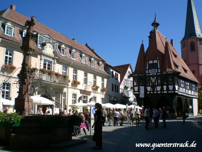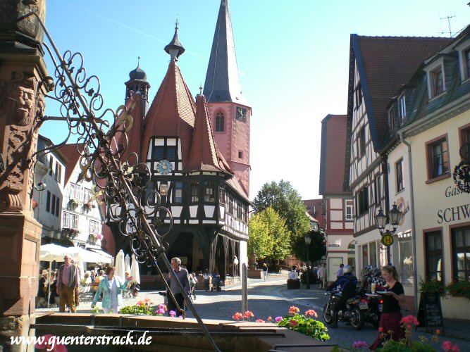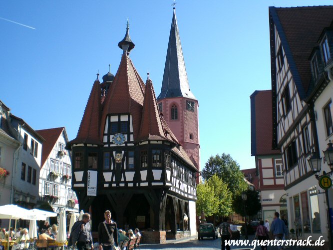 Dann ging es die Straße hinunter zum Marktplatz von Michelstadt. Hier gibt es wieder zahlreiche Fachwerkhäuser zu bestaunen, doch am eindruckvollsten ist das alte Rathaus, welches auf Holzstelzen gebaut ist. Sieht schon ziehmlich cool aus und ist ein weltbekanntes Motiv, welches sogar schon eine Briefmarke geziert hat. So verwundert es auch nicht, dass es häufig in den Hessischen Geschichten auftaucht. Übrigens hat Günter in seiner Kindheit einige Jahre in Michelstadt gelebt.