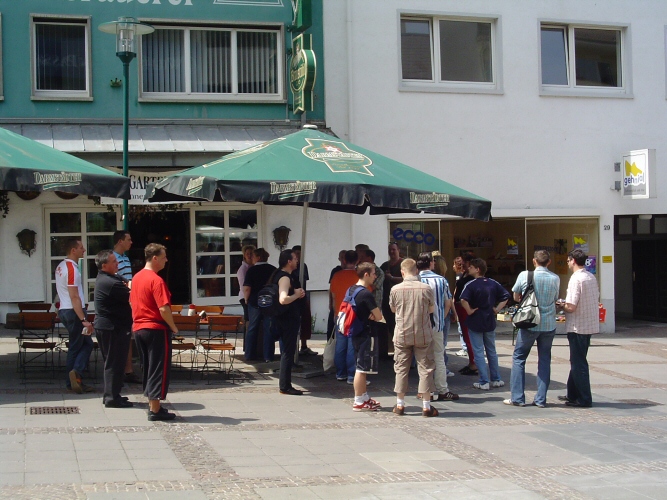 Dann wieder zur Straßenbahn und zum Luisenplatz. Meine beiden Jungs mussten erst mal was Ordentliches essen. Man sah schon überall die Fußballverrückten, die an jeder Ecke mit den Landesfahnen umherliefen und auf das erste Spiel der Weltmeisterschaft warteten. Wir ließen uns davon nicht beirren und sind nach der Stärkung gemütlich in die Wilhelminenstraße geschlendert, um uns das ehemalige Antiquitätengeschäft der Drombuschs anzusehen. Heute ist darin ein Schuhladen untergebracht. Natürlich haben wir es uns nicht nehmen lassen und sind einmal kurz hinein, um uns umzuschauen. In der Weinhandlung gleich daneben haben wir dann für Witta Pohl und Robert Stromberger jeweils eine Flasche Wein gekauft. Mit den Präsenten bepackt ging es wieder Richtung Luisenplatz, zum Schloss hinüber und dann zum Marktplatz vor dem Rathaus. Da uns das heiße Wetter Lust auf Eis gemacht hatte, haben wir uns dann ein schönes kleines Kaffee ausgesucht und uns was Kaltes gegönnt. Kaum stand das Eis auf dem Tisch, bekamen die beiden Christofs einen Anruf, dass sie den vierten im Bund, Christian vom Bahnhof abholen könnten. So trennten wir uns und ich ging zu meinem Lieblingsdarmstädter, Henry Krapp vom Film- und Videoclub. Ich durfte diesmal in die heiligen Hallen des Videoclubs hinein. Nach einem etwas Furcht einflößenden dunklen Kellergangs kommt man in ein wirklich behagliches Clubambiente. Wir quatschten ein paar Minuten über die letzten Neuigkeiten und dann ließ ich den Clubabend ungestört weiterlaufen. Christof und Christof hatten in der Zwischenzeit Christian am Bahnhof abgeholt und erwarteten mich bereits vor dem Restaurant "Sitte". Wir wollten am Abend vorm Fantreffen wenigstens mal Probe essen. Das Restaurant war relativ leer und so bekamen wir sehr schnell unsere reichlich gefüllten Teller und ich muss sagen, es hat vorzüglich geschmeckt. Spät abends gesellte sich dann noch ein Darmstädter Stadtrat zu uns, der Anton. Wir haben noch ewig gelabert, bis uns vieren vor lauter Müdigkeit die Augen fast zugefallen wären und wir uns zum Hotel aufmachten. Am nächsten Morgen beim Frühstück stellte sich das erste nervöse Kribbeln in der Magengegend ein. Unbeirrt davon und frisch gestärkt haben die Jungs dann das Mietauto für die Witta besorgt und ich habe die am Vortag bestellten Blumen abgeholt. Zusammen mit meinem Auto sind wir dann halb 1 zum Maritim-Hotel aufgebrochen. Tja, die Parkplatzsuche wäre ein Roman für sich gewesen und soll hier nicht weiter erwähnt werden *zwinker*. Jedenfalls, nachdem wir erst am falschen Hotel waren (es gibt zweimal Maritim in Darmstadt) haben wir es endlich gepackt. Und als der Fahrstuhl aufging und unsere Witta tatsächlich freudestrahlend uns entgegen kam, da haben wir erst so richtig begriffen, wie toll dieser Tag wohl werden könnte. Nach einer sehr herzlichen Begrüßung haben wir uns dann gesputet, da wir schon erheblich zu spät dran waren. Ich bin schon mal vor und habe mich zu den Fans an der Wilhelminenstraße gesellt und meinen Camcorder ausgepackt. Keine zwei Minuten später kamen Christof, Christof, Christian und die Witta aus der Wilhelminenpassage und man konnte auf beiden Seiten das Staunen spüren. Die Fans, die nicht glauben konnten, dass wirklich Witta Pohl uns die Ehre gab und Witta und die Jungs, die nicht glauben konnten, dass tatsächlich so viele Fans, ca. 35, gekommen waren. Nun konnte es endlich mit etwas Verspätung losgehen.