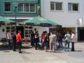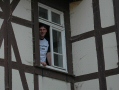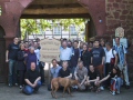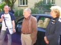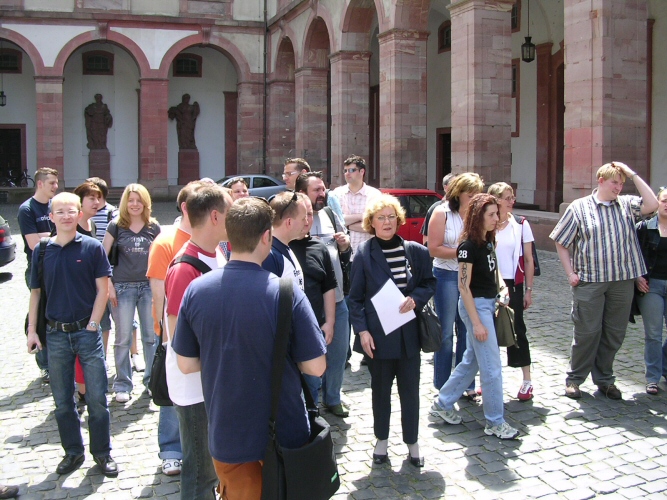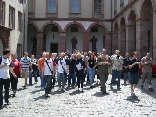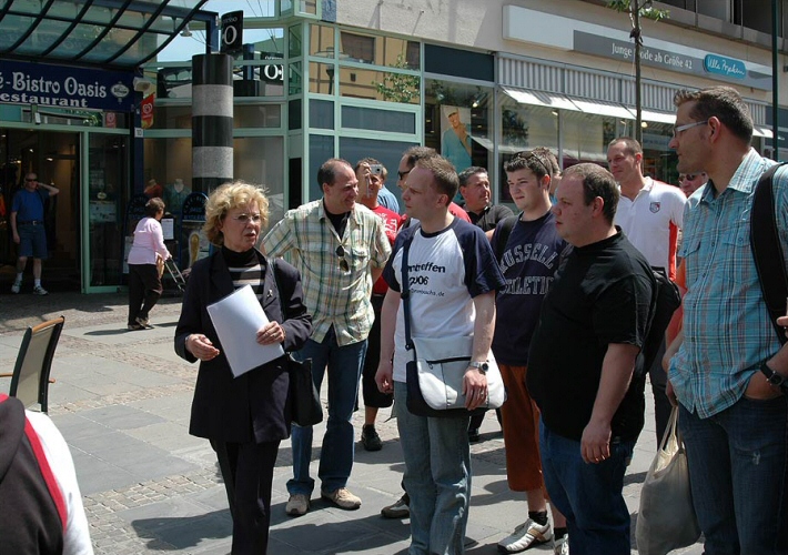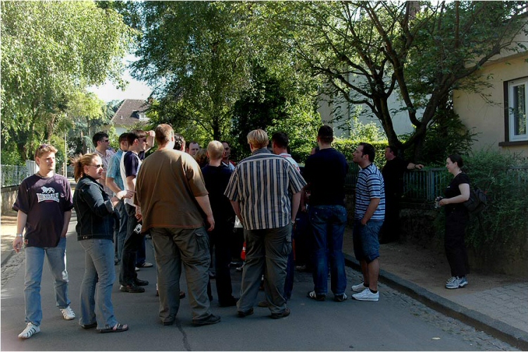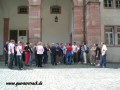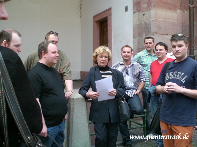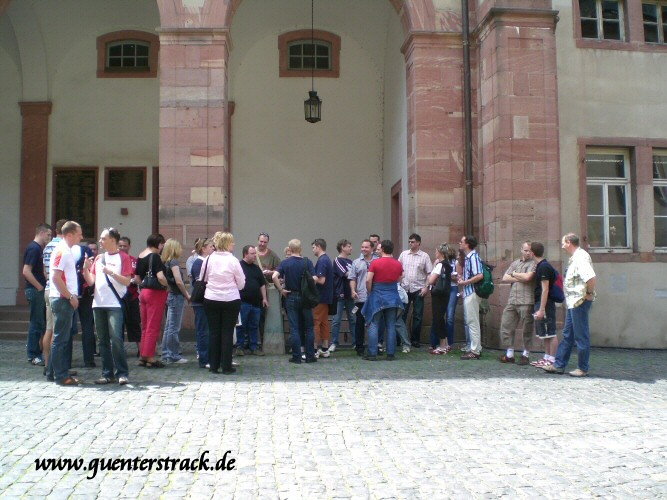 Mit Witta in unserer Mitte haben wir uns nach einer kurzen Besichtigung des ehemaligen Antiquitätengeschäfts, auf den Weg quer durch die Fußgängerzone zum Schloss gemacht. Hier angelangt sahen wir uns den Eingang zu Marions Lokal "Katakomben" an. Es gab zwar nicht soviel zu sehen, aber wenigstens waren hier nicht solche Menschenmassen und so nutzten wir die Zeit und machten einen kleinen Anwesenheitsscheck und teilten die Leute auf die vorhandenen Autos auf, um Fahrgemeinschaften zu bilden. Einige nutzten auch schon die Chance mit Witta Gespräche zu führen. Am Schloss führte uns unser Weg noch zum Polizeirevier, wo Chris Drombusch arbeitete. Christof 1 ganz forsch, ging einfach rein und fragte, ob wir uns mal umsehen dürfen und die freundlichen Polizisten ließen uns tatsächlich alle hinein.