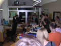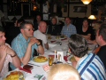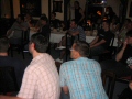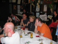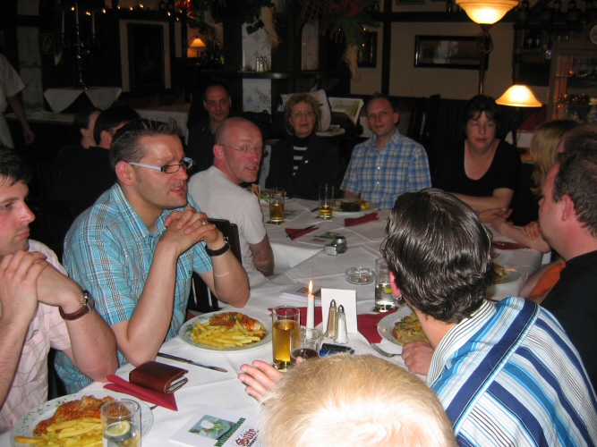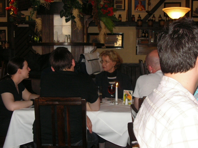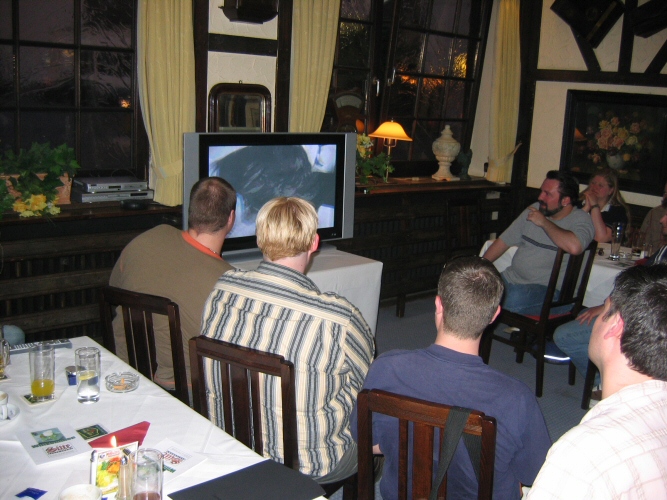 Da es schon nach 18 Uhr war und die meisten vor Hunger und Durst kaum noch stehen konnten, beschlossen wir gleich in die "Sitte" zu fahren. Also, alle Fans wieder in die Autos und losgedüst, während die Webmaster die Witta in ihr Hotel fuhren, damit sie sich etwas frisch machen konnten. In der "Sitte" angekommen, waren wir doch sehr enttäuscht, dass der Service bei weitem nicht so gut war, wie am Vorabend. Nur ein Kellner für knapp 40 Leute ist einfach zu wenig. Der Raum selbst war zwar schön gestalten, doch verfügte er nicht über eine Klimaanlage, so dass die paar gekippten Fenster keine wirkliche Erholung von der Hitze des Tages verschafften. Doch als die Witta mit den Jungs endlich eintrafen, waren Hunger und Durst bald vergessen. Nach dem Essen und einigen Worten der Webmaster sahen wir uns dann gemeinsam die Drombusch-Teamfilme an. Herrlich schräge Typen, diese Filmleute! Am besten kamen wohl die vermasselten Szenen von Anja Jaenicke "Yvonnchen" an, die zwar trotz Drehbuch stumm sein sollte, in einer Szene aber plötzlich losprustete "Lass mich doch endlich in Ruhe, du Arsch!" und Eike Hagen Schweikhardt als "Thomi" der zu unserm Onkel Ludwig meinte, ob er nicht "ein Eis mit heißen Tomaten" wolle. Gegen kurz vor 23 Uhr löst sich das Fantreffen erschöpft aber glücklich über diesen tollen Tag auf und übrig blieben die Jungs und Witta. Zusammen haben wir dann noch einen kleinen Absacker getrunken und hätte uns der Kellner nicht sehr unfreundlich zu verstehen gegeben, dass er jetzt Feierabend machen wolle, wären wir sicher noch länger sitzen geblieben. Na ja, halb eins reicht ja auch