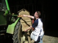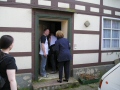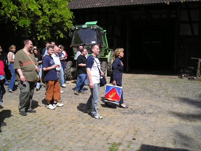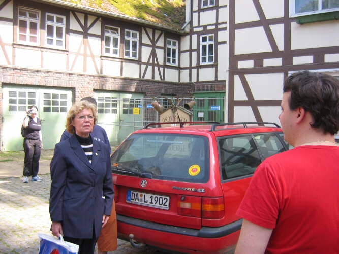 Schon völlig fertig von den vielen Eindrücken liefen wir wieder zum Wohnhaus in der Wilhelminenstraße und bestiegen dann unsere Autos in Richtung Bundenmühle. Ich fuhr bei Tanja, Marc und Marc mit und versuchte sie anhand meiner Landkarte zum Ziel zu führen. Kaum angekommen musste ich mit Entsetzen feststellen, dass schon fast alle Fans da waren, nur unsere Hauptakteure mit der Witta fehlten noch. Ich nutzte also die Zeit, kurz die Besitzer der Mühle zu begrüßen und mich mit meinem Camcorder in gute Schussposition zu bringen. Es dauerte noch endlose Minuten bis das silberne Auto endlich in die lange Einfahrt einbog. Aber das Warten hatte sich gelohnt. Nachdem Witta die Mühlenbesitzer herzlich begrüßt hatte, betraten wir ehrfürchtig den Innenhof der Mühle durch das Eingangstor. Man konnte der Witta deutlich ansehen, wie bewegt sie von dieser Kulisse war. Wie viele Emotionen und Erinnerungen wieder in ihr hervorkamen. Es war wirklich sehr ergreifend. Wir ließen Witta dann ein paar ruhige Minuten, in denen sie sich mit den Mühlenbesitzern zurück ziehen konnte. Währendessen durchstöberten wir die Mühle. Wir durften sogar in eines der Nebengebäude, in denen früher Maske und Garderobe untergebracht waren. Ein herrliches Gefühl. Leider mussten wir aber auch erfahren, dass die Mühle nun zum Abriss freigegeben wurde, denn das halb eingestürzte Dach war nach dem langen harten Winter noch mehr zerstört und das Anwesen wurde zu einer Gefahr. Wir Fans nahmen diese Nachricht mit Trauer und Entsetzen auf. Vielleicht finden wir ja noch einen Weg das Andenken an die Mühle zu erhalten.