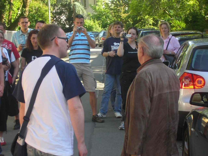 Nachdem wir endlich alle Fotos verschossen hatten, haben wir uns im Autokorso auf den Weg zurück nach Darmstadt gemacht und tatsächlich keines der 9 Autos auf dem Weg dorthin verloren. Am Löwentor warteten wir auf das Erscheinen des Autors Robert Stromberger. Als er dann endlich kam und uns mit Lichthupe begrüßte versagte mein Akku des Camcorders. Bis ich den Ersatzakku eingelegt hatte, war der Robert schon ausgestiegen und von Fans umringt. So drängelte ich mich einfach in die erste Reihe und hielt das Objektiv nur noch auf ihn. Er hat uns fast eine dreiviertel Stunde Rede und Antwort gestanden. Da das Gespräch mitten auf der Straße stattfand wurden wir leider des öfteren von vorbei fahrenden Autos unterbrochen, da wir jedes Mal erst die Straße räumen mussten. Dann verabschiedeten wir Robert Stromberger noch mit einem dicken Applaus und einige holten sich Autogramme.